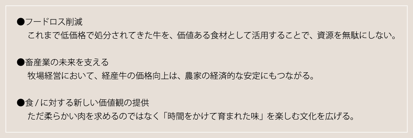 - これまで低価格で処分されてきた牛を、価値ある食材として活用することで、資源を無駄にしない。